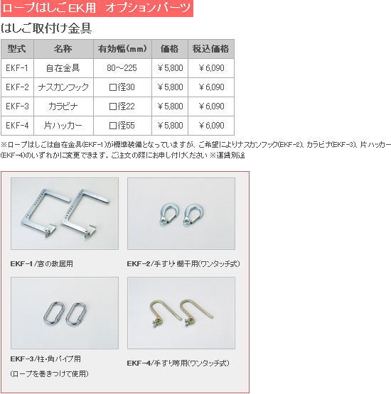 【種類別工具】 ピカ:PICA 避難用 ロープはしご価格: 30,147円レビュー評価: 0.0 レビュー数:0 ●商品番号:EK-8●【全長(m):質量(kg)】 【8:11.4】 ●【全長(m):質量(kg):ロープ径】 【8:11.4:φ12.5クレモナロープ】 自在金具(窓の敷居用)標準装備 ご希望によりナスカンフック(EKF-2)、カラビナ(EKF-3)、片ハッカー(EKF-4)のいずれかに変更できます。 ※重量が重い物や、サイズが大きいものは別途送料を頂戴させていただく場合がございます。 【全長(m):質量(kg)】【8:11.4】【全長(m):質量(kg):ロープ径】【8:11.4:φ12.5クレモナロープ】自在金具(窓の敷居用)標準装備ご希望によりナスカンフック(EKF-2)、カラビナ(E |